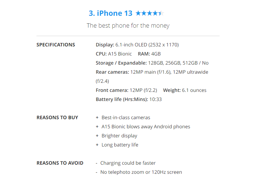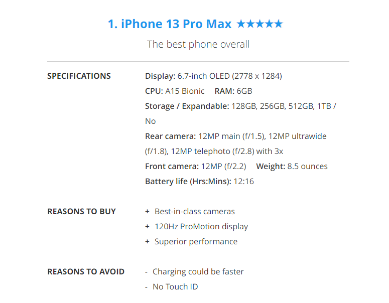 The iPhone 13 Pro Max earns the title of best phone thanks to a number of key upgrades. This includes a new 6.7-inch ProMotion display that scales up to 120Hz for silky smooth animations, awesome performance from the A15 Bionic chip and epic battery life of over 12 hours in our web surfing test.The cameras on the iPhone 13 Pro Max are simply best in class, thanks to improved sensors that capture more light and a new Photographic styles feature that lets you tweak the look of your pics. But the coolest camera features are a new macro mode that helps you shoot awesome close-ups and a Cinematic mode for video that delivers a compelling bokeh effect along with automatic focusing between subjects.The charging could be faster. But, overall, the iPhone 13 Pro Max is second to none among smartphones.