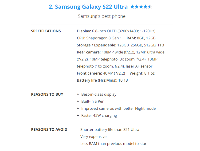 The Samsung Galaxy S22 Ultra is the ultimate Android phone for power users. It delivers a built-in S Pen just like a Galaxy Note, and you get 70% less latency for smoother performance. The 6.8-inch display is simply the best we've tested, offering class-leading brightness and color saturation, making this panel easy to read outdoors in direct sunlight and fantastic for watching shows and movies.The other big reason to buy the Galaxy S22 Ultra is the camera improvements. There's a larger main 108MP sensor that lets in more light, which means brighter pictures without having to use Night mode. And when you do engage Night mode, you'll get even better pics in some scenarios than the iPhone 13 Pro Max. Add in faster 45W charging and a sleek design and you have a winner. We just wish the battery life were a bit longer.