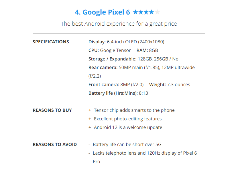 The Google Pixel 6 is the best smartphone to get if you want the ultimate Android experience, especially now that Google has started using its own Tensor chipset to power the phone. Tensor keeps pace with the Snapdragon 888 inside most of the other top Android phones, but more importantly, it powers the kind of machine learning-driven experiences that make Google's phones unique.The cameras feature a 50MP main lens, but the real story remains the software, where Tensor helps power features like Magic Eraser for easily removing people from the background of your shots and Motion Mode for making action shots look more dynamic. If you want a telephoto lens and a bigger display, you can always upgrade to the Pixel 6 Pro for $899.That's $300 more than the starting price for the Pixel 6, and that cost happens to be one of the better features of the phone. It's hard to find a better starting price for such a premium device.