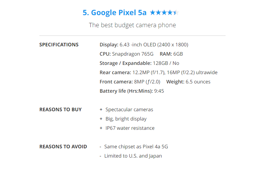 The Google Pixel 5a is the best sub-$500 phone you can buy right now, as it offers the best photography available on a mid-range phone. If you don't want to spring for a pricey flagship device, the Pixel 5a is your best alternative, particularly for fans of Android.With the Pixel 5a, Google adds a second rear lens to its budget phone — a 16MP ultrawide shooter to augment the 12.2MP main camera. That expands the Pixel 5a's flexibility over previous models, while the phone continues to benefit from Google's prowess with computational photography. The Pixel 5a's display is big and bright, and this phone offers IP67 water resistance, something missing from past A series models.You will pay $100 more for the Pixel 5a than the Pixel 4a's bargain basement price, but Google has added 5G connectivity and an improved processor to this model. (The Pixel 5a also costs $50 less than last year's Pixel 4a 5G.) The Tensor ship in the Pixel 6 delivers a better overall experience, and it's only $150 more than the Pixel 5a, but Google's least expensive new phone remains an outstanding option for bargain hunters.